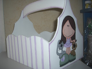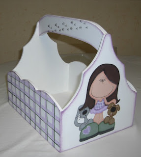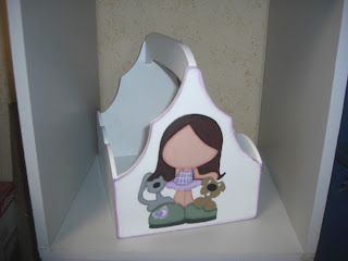 Quadro com miniaturas, fundo decorado com papel de scrap com flores. Banheira em loiça, quadro com passarinho, móvel com toalhas, perfumes, saboneteira e algodão. Toalheiro com toalha e frasquinho com sais de banho, jarra com flores, relógio, Moldura com decapê branco/azul.